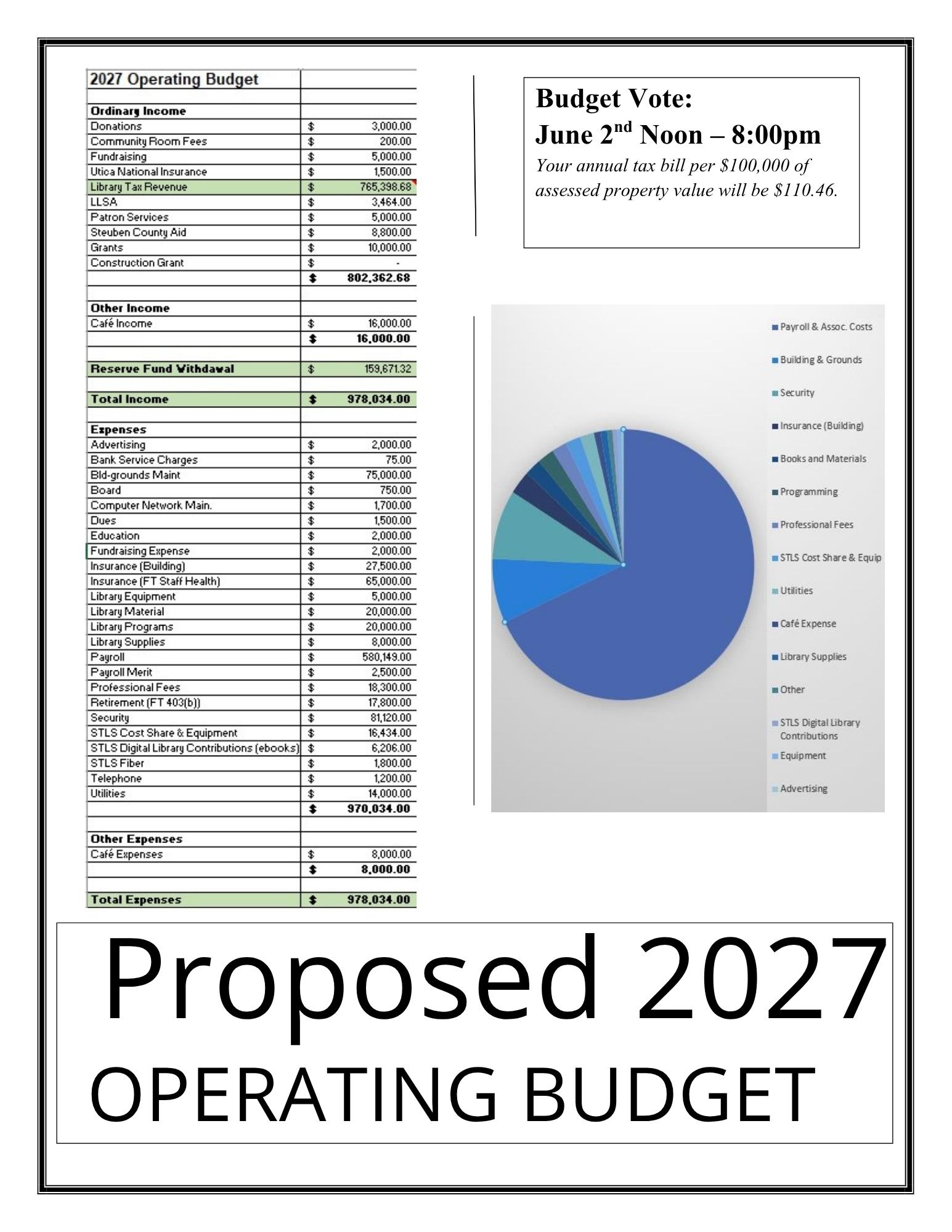 The vote will take place from noon until 8:00pm on June 2nd, 2026 at the Dormann Library.  We encourage all members of the school district to participate.