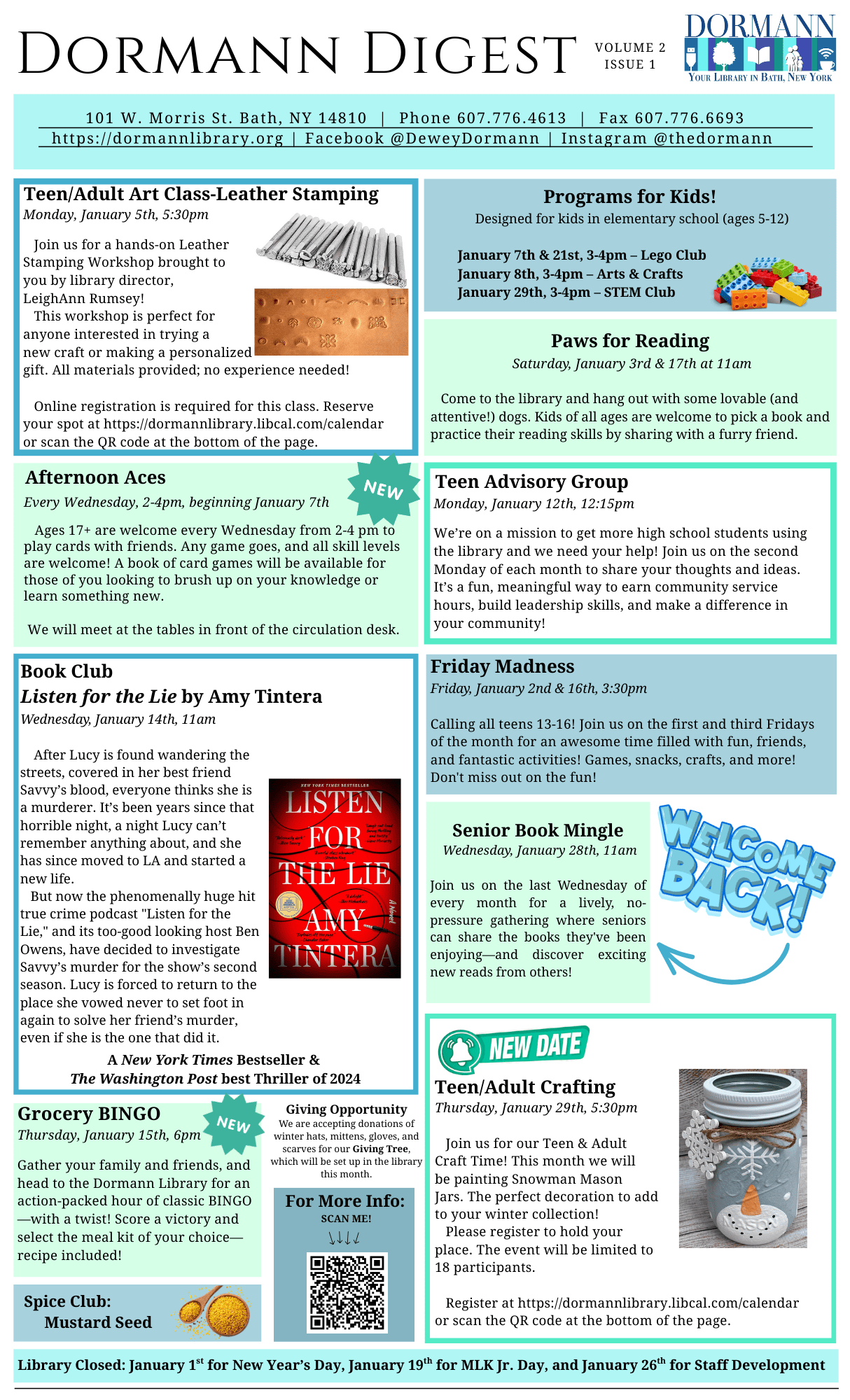 Please note: The library will be closed December 23 at 2 pm and December 24 – 26 for the Winter Holiday. Closed December 31 for the New Year Holiday